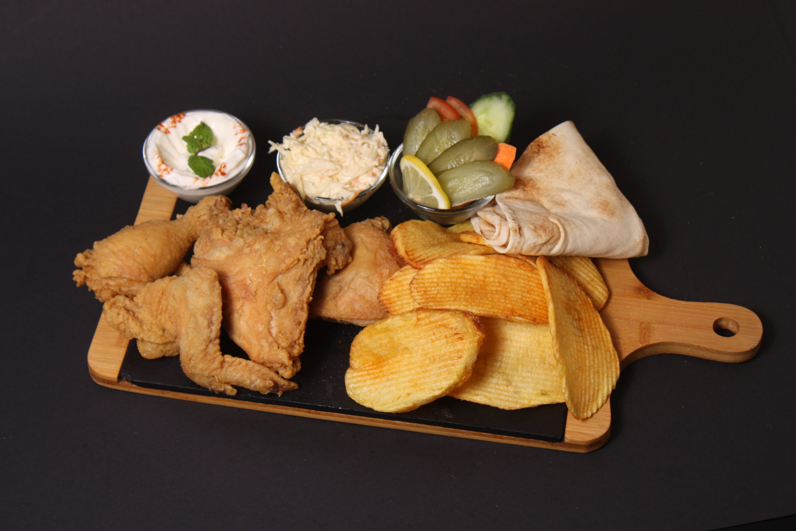Hähnchen Sandwich mit Knoblauch creme, Pommes, Salat, Sauce