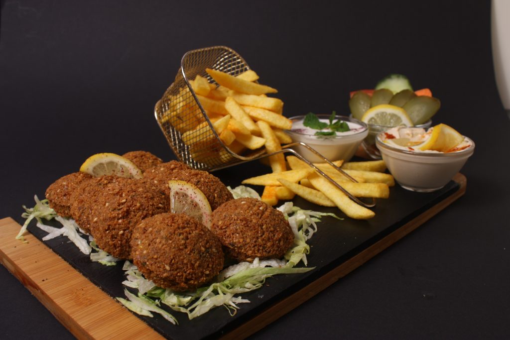 8 Stück Falafel, Hummus, Salat, Pommes
